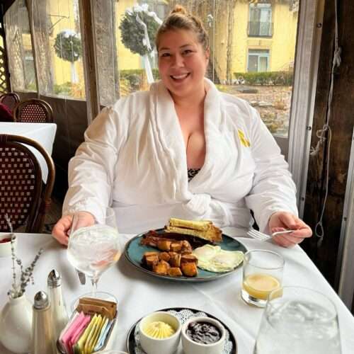 We’re staying in a luxury king suite with a garden view that’s as peaceful as it is pretty. The bed is heavenly. I know because I’ve slept in it. It’s like being held in a cloud that understands your back pain. The room also comes with its own fireplace, a private bathroom, shower, and a clawfoot tub that practically begs for wine and bubbles 🍷🛁